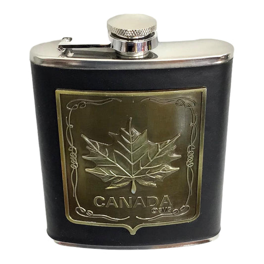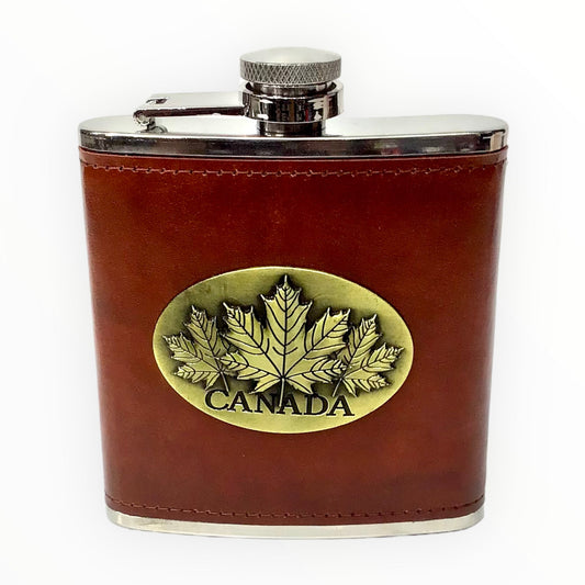Leather Liquor Flask, 6-Ounce, Brown with Maple Leaf 3D Metal Theme