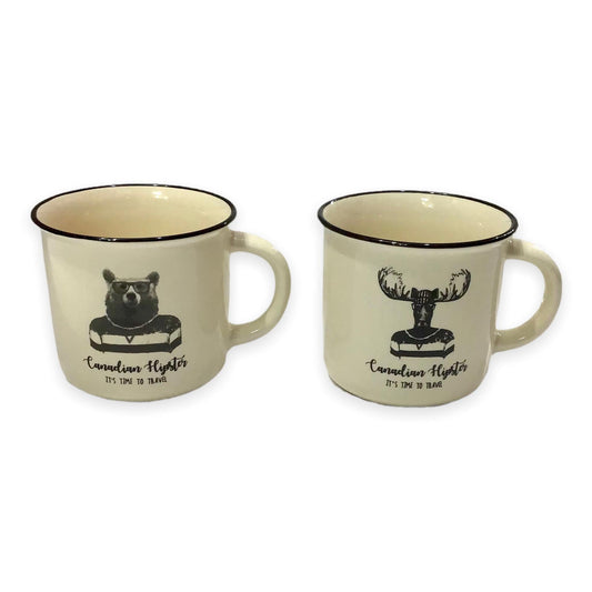 Moose and Bear Canadian Hipster It’s Time to Travel Cream Color Ceramic Coffee Mug Set