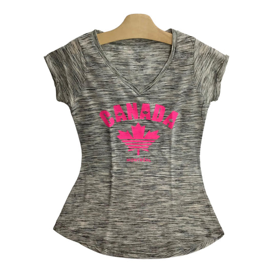 Pink Maple Leaf Canada Women V-Neck T-shirt on Mixed Charcoal Background Shirt