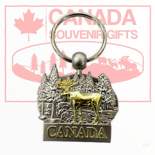 Metal Keychain - Canada Moose in Gold Tone Key Holder - Silver Tone Background Key Fob