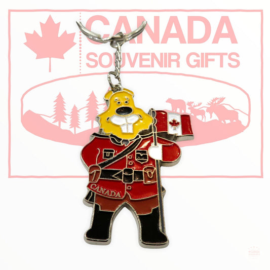 Metal Diecast Keychain - Beaver RCMP Officer Holding Canada Flag | Key Holder Souvenir Porte Cle