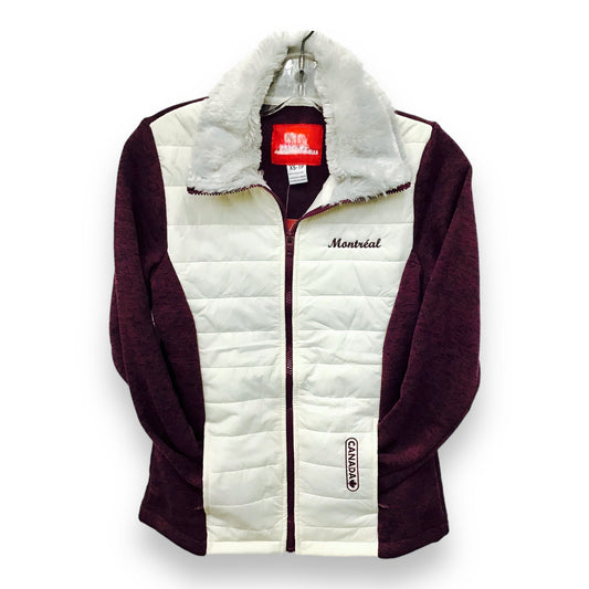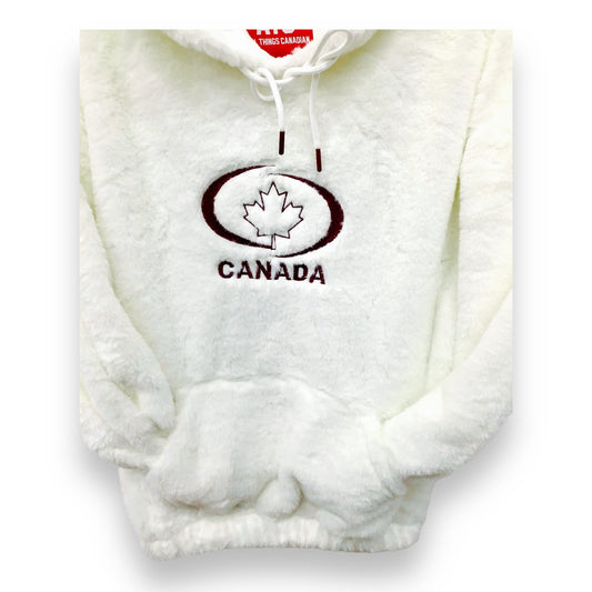 Women Cream Off-white Faux Fur Hoodie - Canada Maple Leaf Embroidery Front Themed Sweatshirt