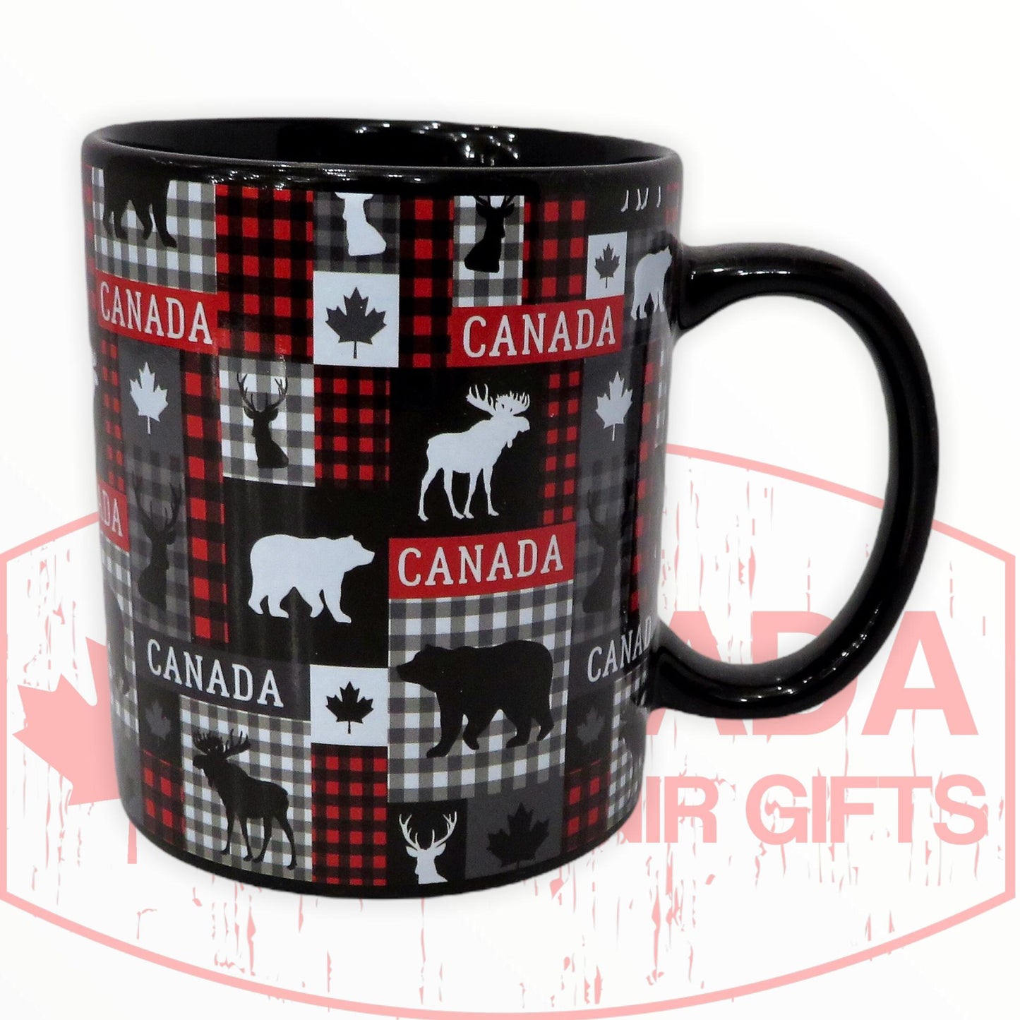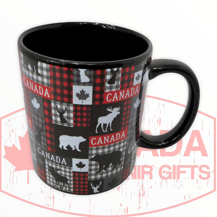 Canada Coffee Mug with Canadian Highlights - Moose, Bear, Deer, and Maple Leaf - Plaid Themed Design Ceramic 13oz