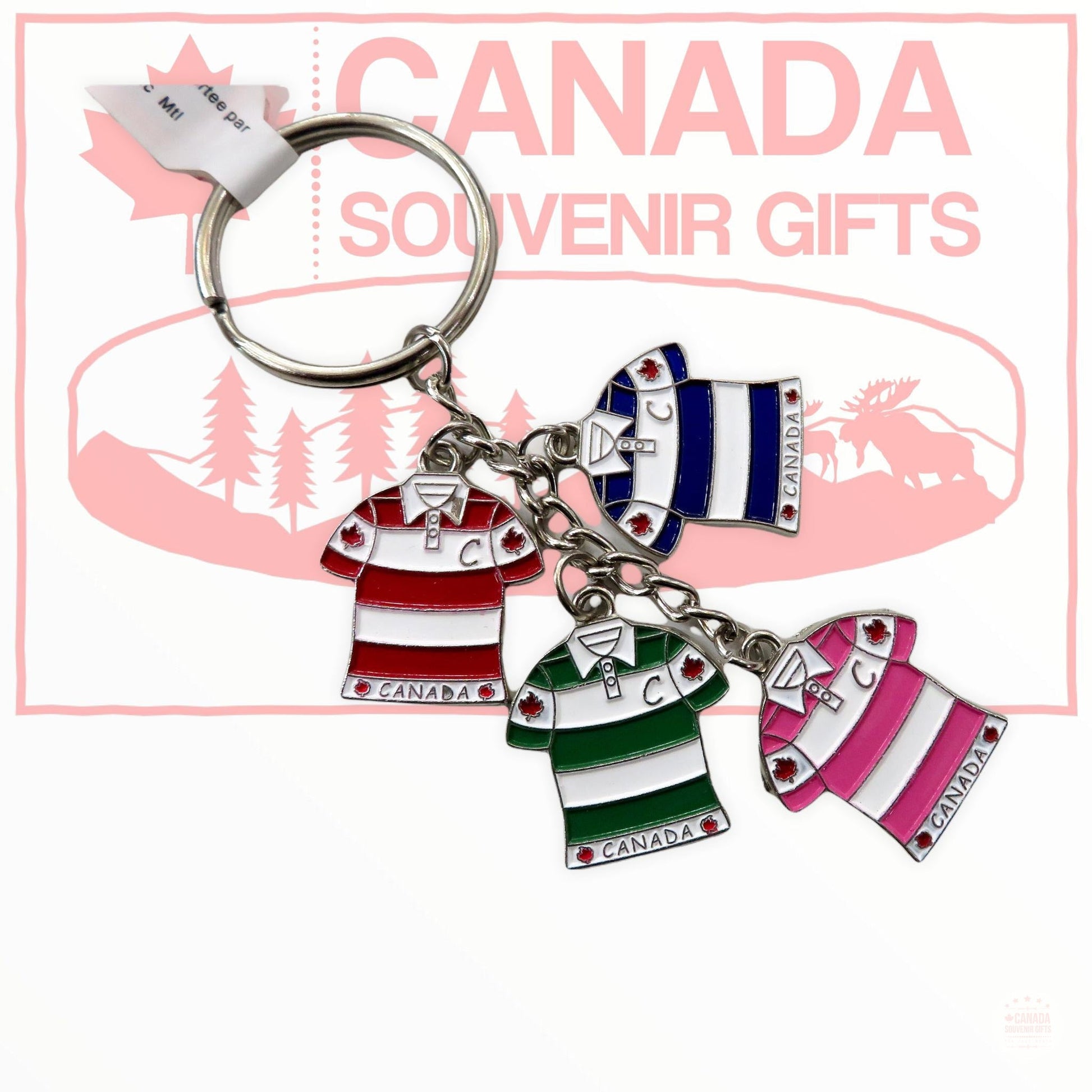 Emblem of Canadian Spirit and Diversity: Celebrate the rich heritage and diverse cultures of Canada with this keychain featuring a collection of miniature T-shirts adorned with the iconic maple leaf. The assortment of colors and designs represents the country's vibrant spirit, unity, and the diverse backgrounds of its people.