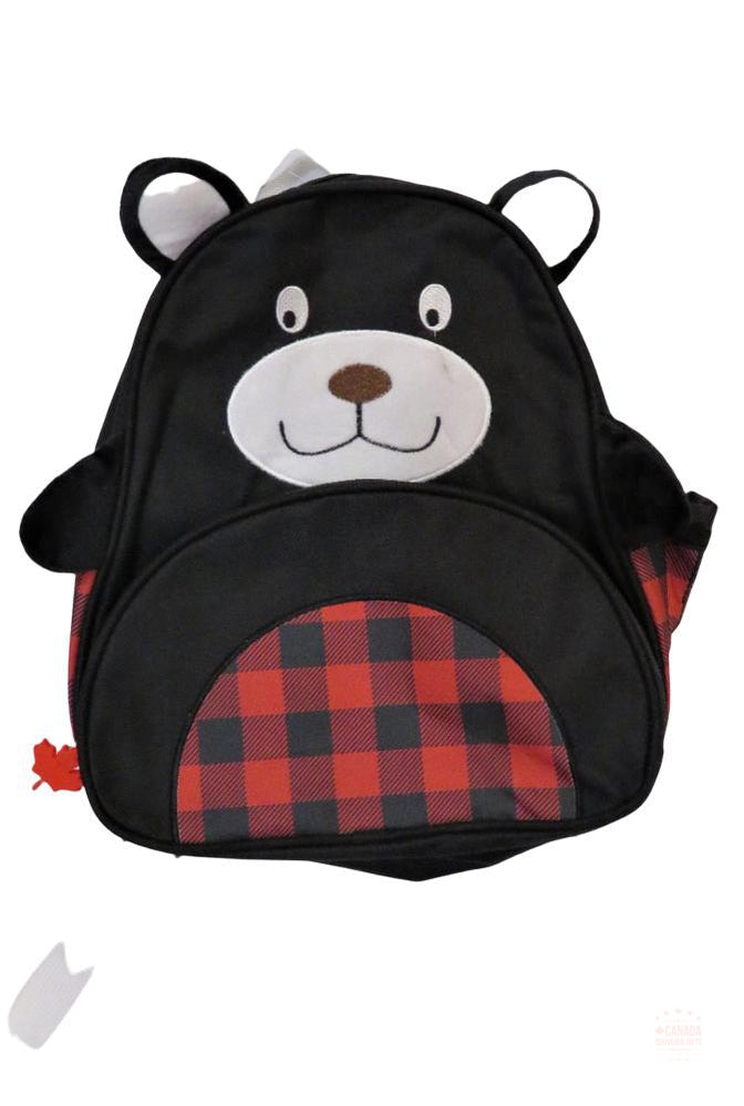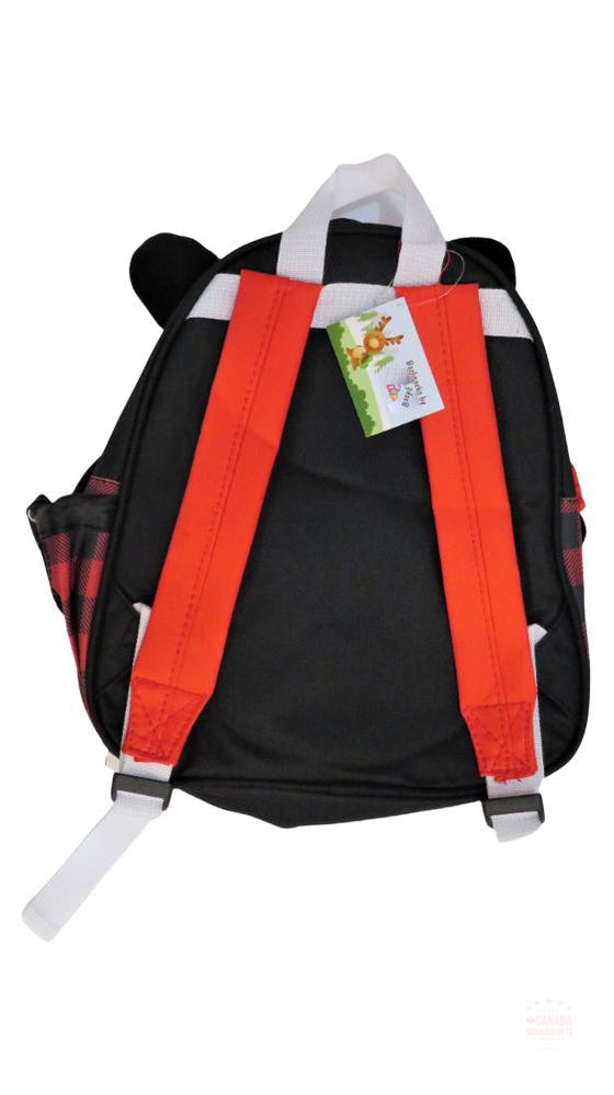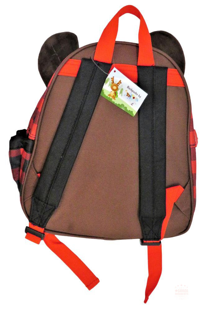 Adorable Canadian Wildlife Design: The backpack showcases an adorable ensemble of a happy moose, bear, and beaver against a classic plaid background, celebrating Canada's rich wildlife.