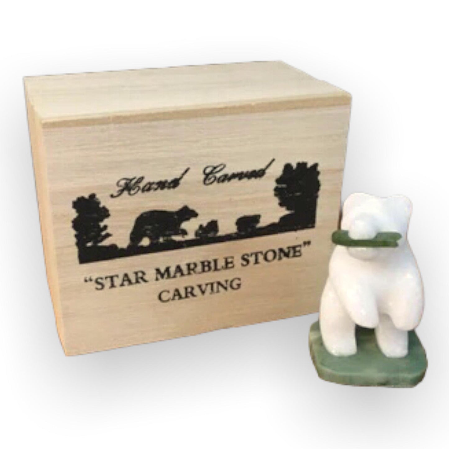 Star Marble Bear Standing With Fish, 2" - Marble Bear With Jade Fish - Star Marble Carvings - Marble Bear 3" With Jade Fish Gift Boxed - Canadian Souvenir