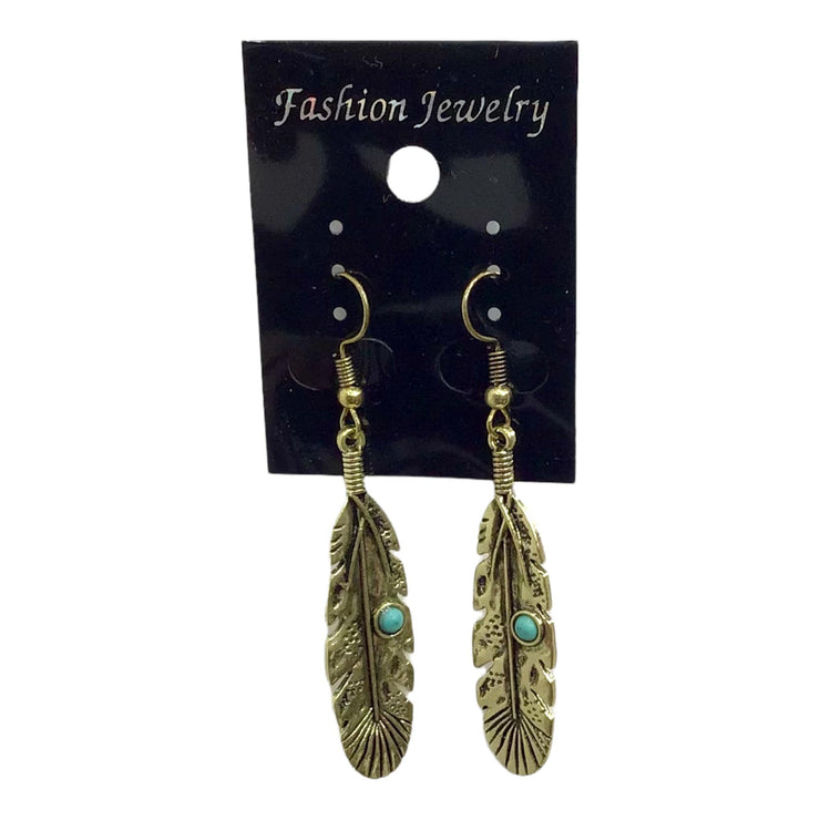 Earrings Brass Feather w/ Turquoise Bead - Canadian Souvenir Gift