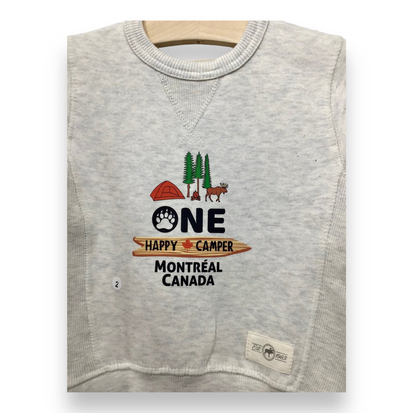 The sweatshirt comes in a unique cream/grey mixed colour that adds a touch of sophistication to any outfit. It features a playful “Happy Camper” design that pays homage to the beautiful city of Montréal.
